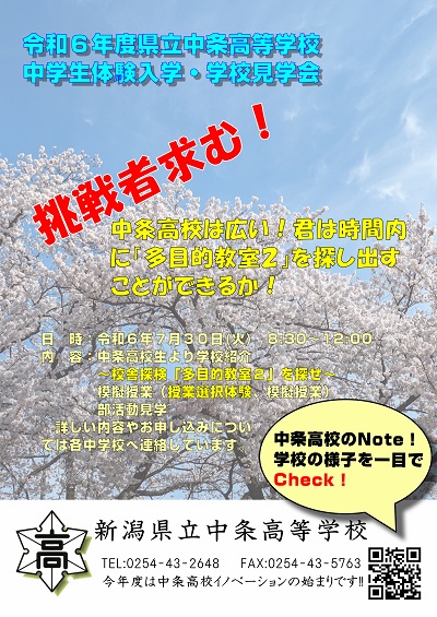 多くの中学生、保護者の皆様に、中条高校の雰囲気や様子を知ってもらいたいと思います。